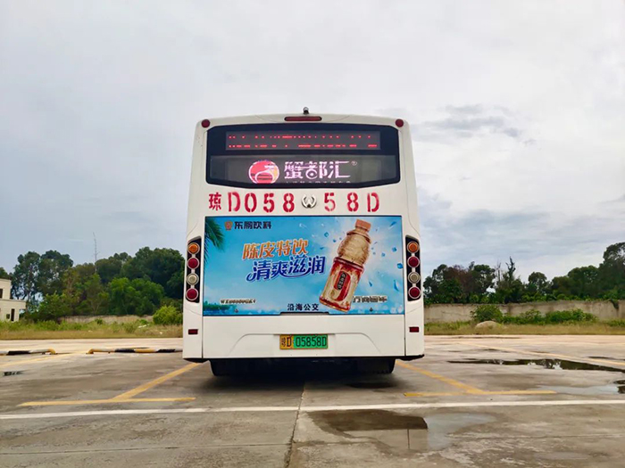 新傳播時代,凱豐傳媒順應客戶多元市場需求,拓寬傳播場景,精選優(yōu)質媒體資源,在文昌市原有公交車身、車內媒體資源的基礎上,增加車尾LED廣告屏,幫助品牌突破傳播屏障,直達戶外出行主流消費人群。
