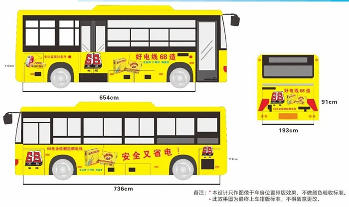 廣告首先要引起目標(biāo)受眾的注意,才能達(dá)到宣傳的效果,所以引起注意至關(guān)重要。68電線此次宣傳,全車采用亮眼的黃色作為底色,加上郎朗上口的宣傳語(yǔ) “好電線 68造”, “老品牌 口碑好 質(zhì)量高” 讓路過(guò)的人們都能影響深刻,產(chǎn)品圖的加持,使得傳達(dá)信息一目了然。